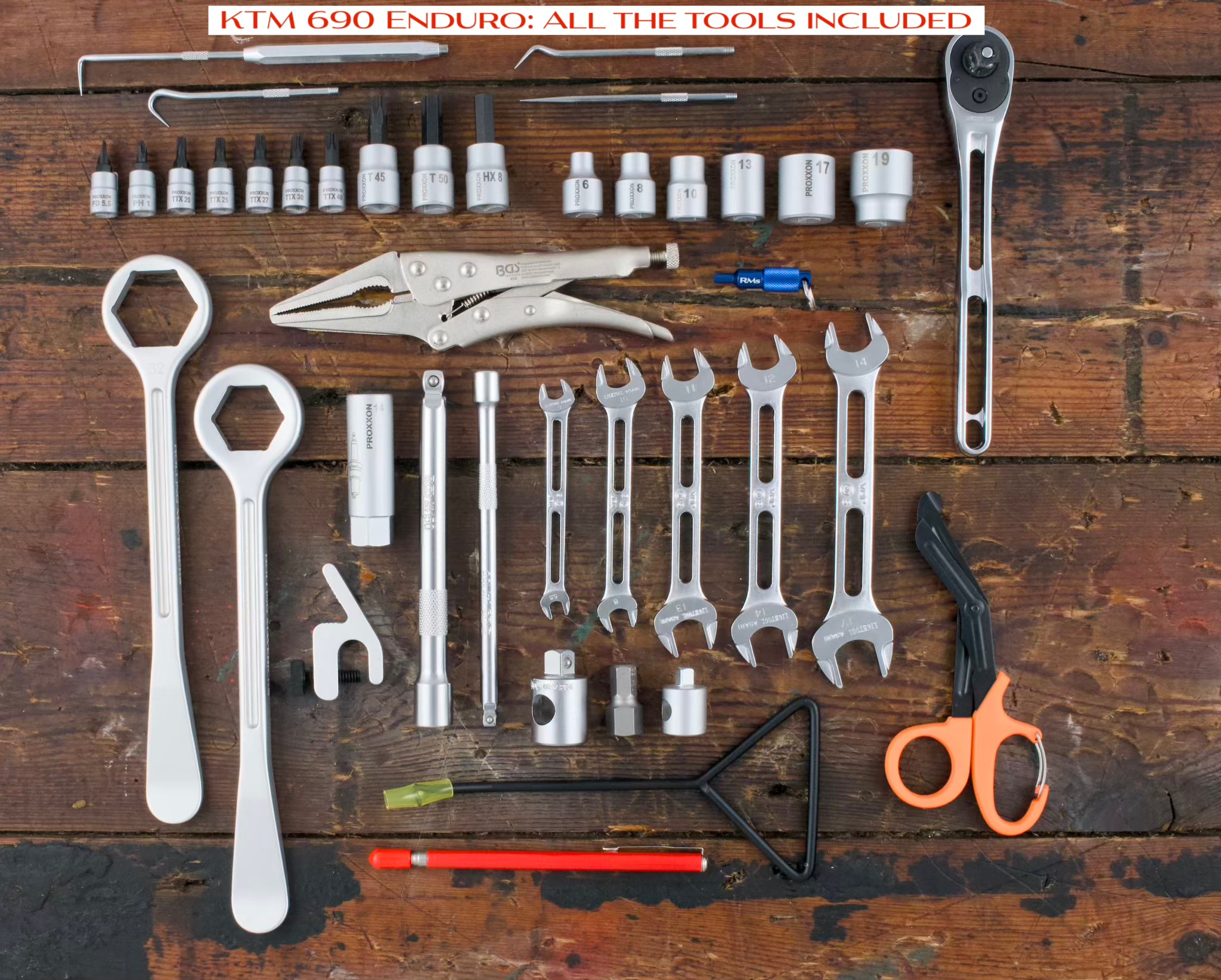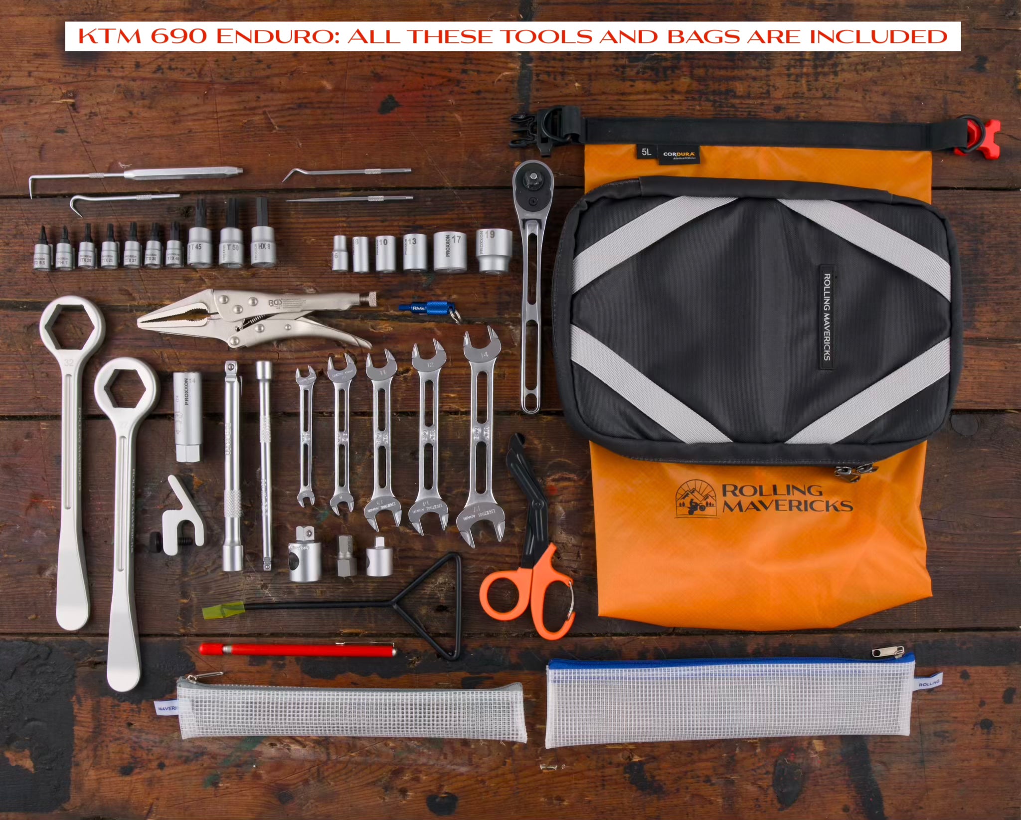 Lernen Sie das Rolling Mavericks Overlander Werkzeugset– RTW-Ausgabe kennen. Es ist das ultimative Werkzeugset für KTM 690 Enduro Abenteuerfahrer, die ihre Maschinen auseinandernehmen, Pannen beheben und weiterfahren, wenn etwas schiefgeht. Ob Sie nun um die Welt reisen, Kontinente überqueren, den TET fahren oder einfach nur Ihr Motorrad zu Hause richtig warten – dieses leichte Werkzeugset enthält genau das, was Sie brauchen – und nichts, was Sie nicht brauchen.