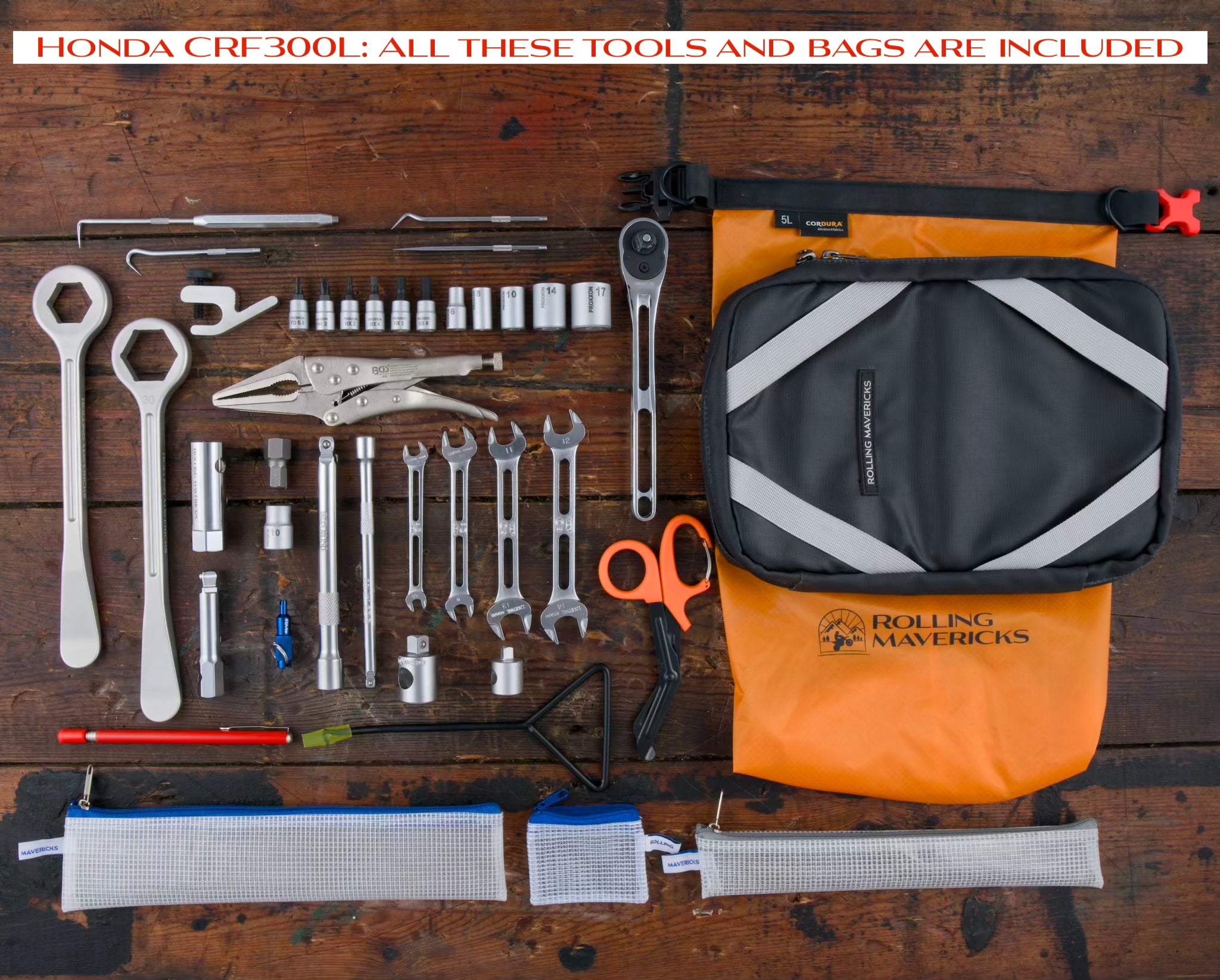 Meet the Rolling Mavericks Overlander ToolKit– RTW Edition. It is the ultimate toolkit for Honda CRF300L adventure riders who take their bikes apart, fix break downs, and keep moving when things go sideways. Whether you’re going around the world crossing continents, riding the TET or just maintaining your bike properly at home , this lightweight toolkit carries exactly what you need — and nothing you don’t.