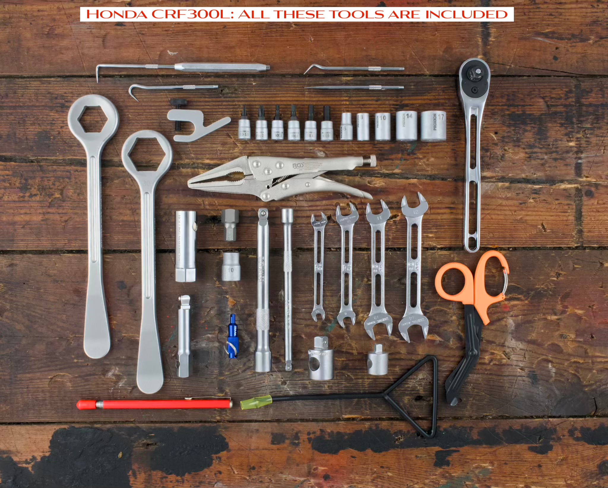 If you bought the Honda CRF300L / Rally Overlander Toolkit, you’ll find a small zippered pouch inside the bag with a warning sticker on it. Inside that pouch are two specific tools: