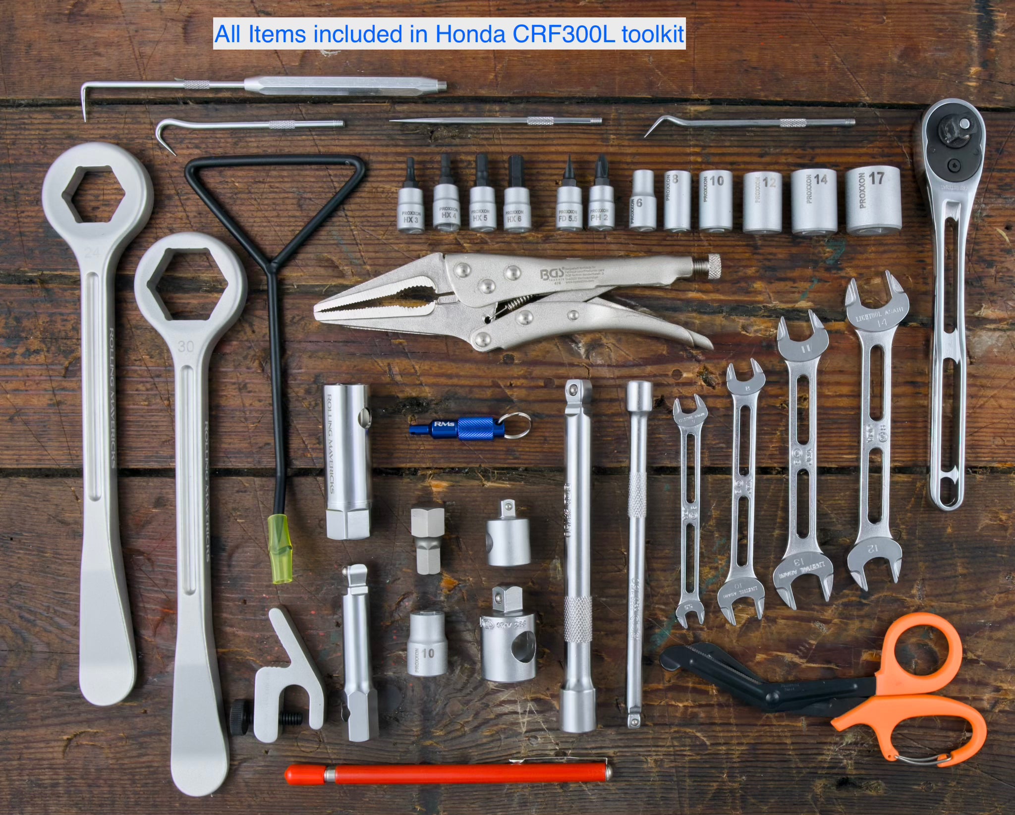 Ismerd meg a Rolling Mavericks Overlander Szerszámkészletet – RTW kiadás. Ez a végső szerszámkészlet a Honda CRF300L kalandmotorosoknak, akik szétszedik a motorjukat, megjavítják a meghibásodásokat, és tovább haladnak, ha valami félresiklik. Akár a világ körül utazol, kontinenseket átszelve, a TET-et járva, vagy csak otthon megfelelően karbantartod a motorodat, ez a könnyű szerszámkészlet pontosan azt hordozza, amire szükséged van — és semmi olyat, amire nincs.