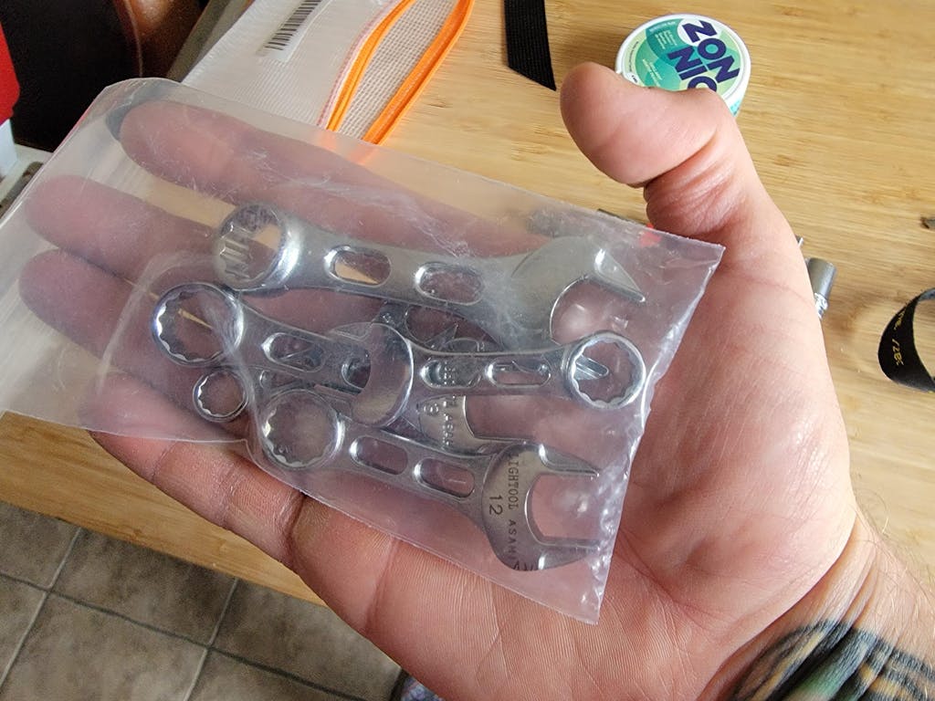 Deze hoogwaardige, in Japan gemaakte Asahi LIGHTOOL Mini Combinatiesleutelsets zijn voor de minimalistische motorrijder die gewicht en ruimte in zijn gereedschapsrol wil besparen. Gemaakt van gesmeed chroom-vanadiumstaal, weegt de 3-delige set voor Japanse motorfietsen slechts 50 gram, de EU-versie 58 gram en de Ultieme 5-delige set stubbies slechts 127 gram.