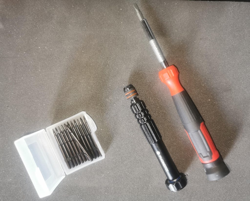 Up to 5 heads fit inside the screwdriver housing, weighing about 35 grams. The knob on top of the screwdriver has a bearing and rotates without friction, making removing screws with one hand easy.