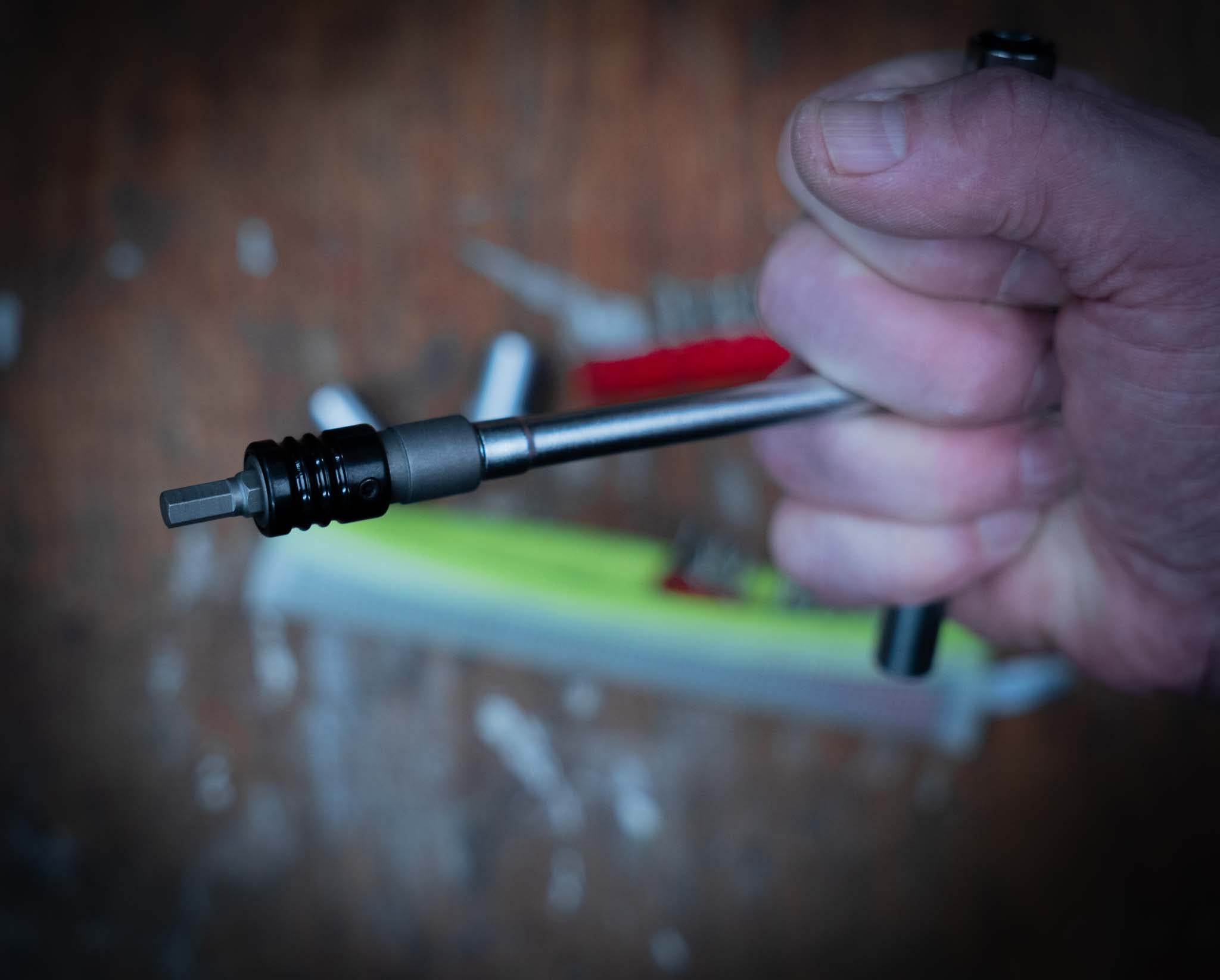 Adaptor 1/4" cu suport rapid pentru biți, luați câțiva biți de șurubelniță de 1/4" și o cheie pentru bujii, și veți avea un trusă convenabilă care încape perfect în buzunarul jachetei — ideală pentru orice reparație pe traseu la motociclete Enduro sau Adventure.